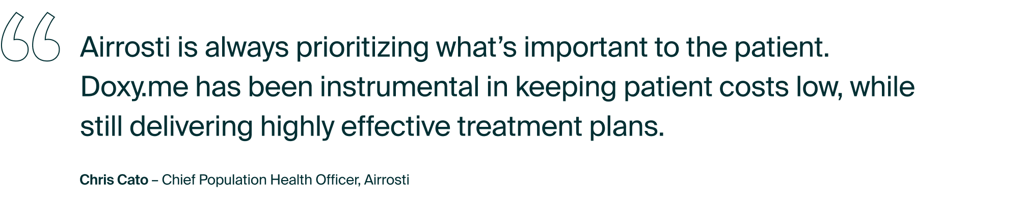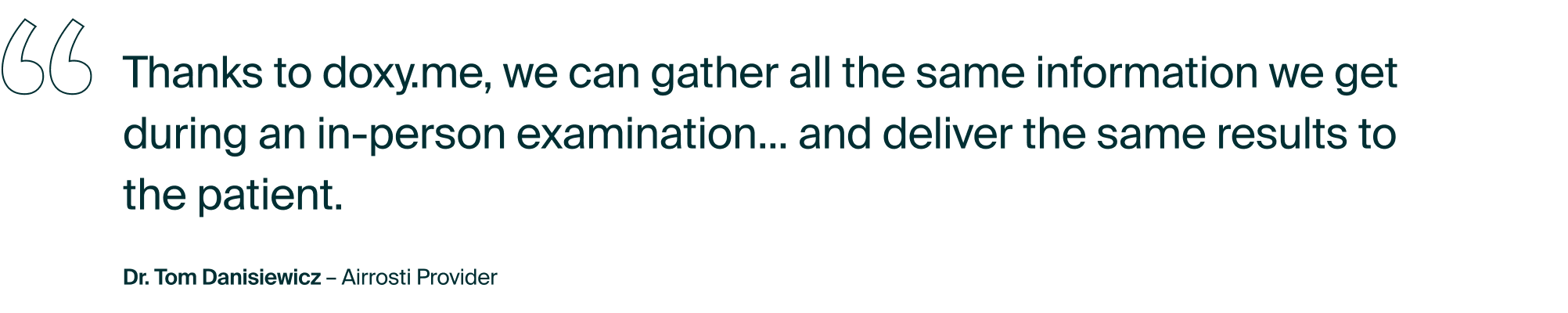 Airrosti has been delivering industry-leading musculoskeletal care for over 20 years and has impacted over 1.5 million patient cases. Focused on growing their impact and reaching more individuals, Airrosti is continuing to expand their virtual care offering, powered by doxy.me. The telemedicine platform has enabled Airrosti to scale nationally, and now powers a full suite of products from virtual triage through to injury resolution via in-clinic, hybrid, or remote care.