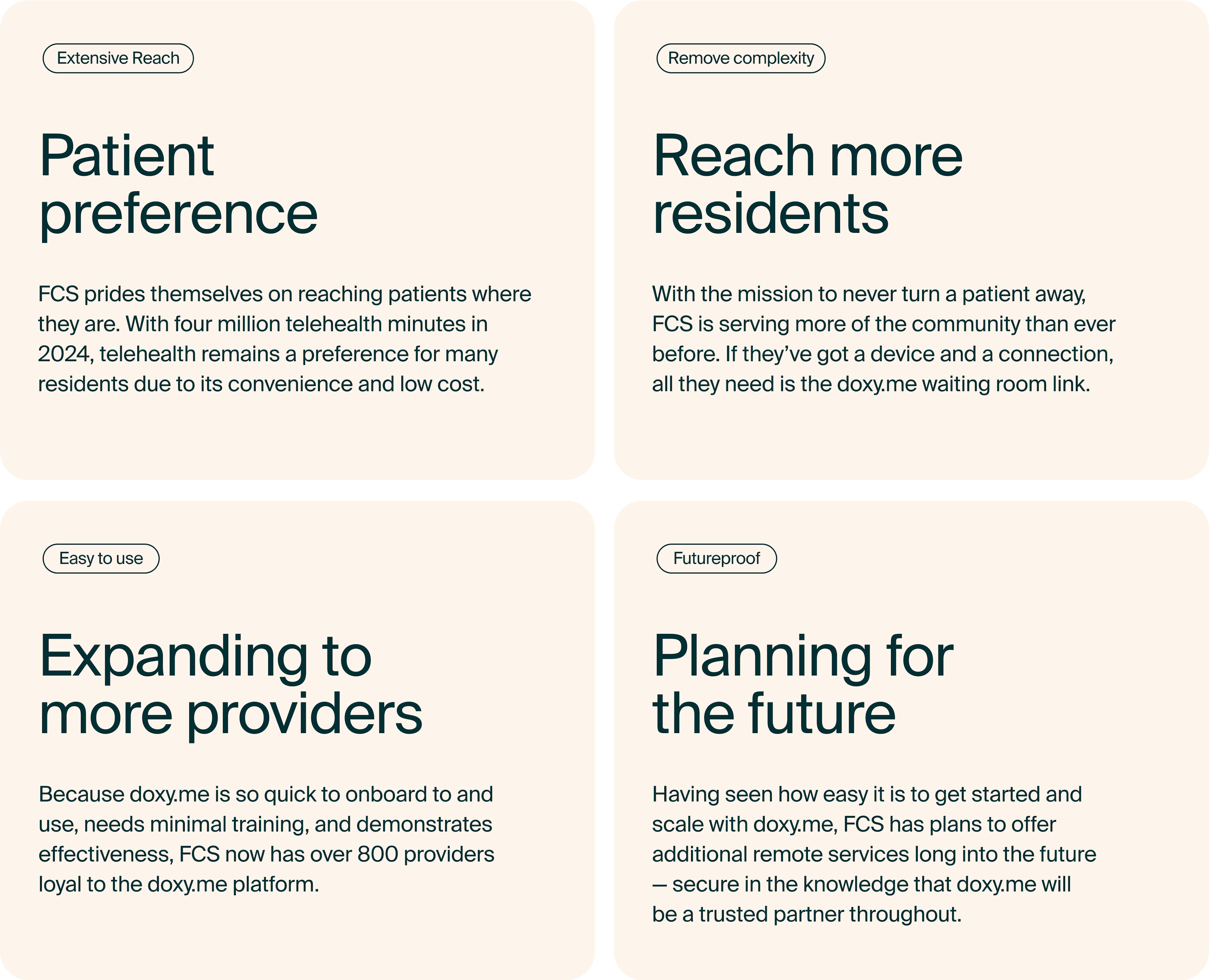 But how does FCS manage to reach so many? Telehealth has played a major role, especially when accessing the hardest-to-reach residents, who are most in need of care. Having held almost four million minutes on doxy.me’s telehealth platform in 2024, FCS is providing more impact than ever.