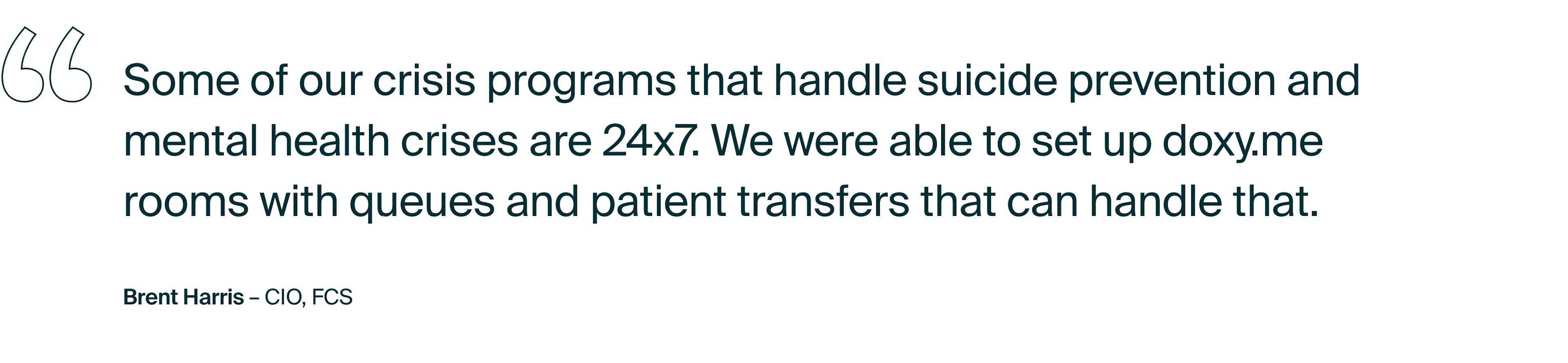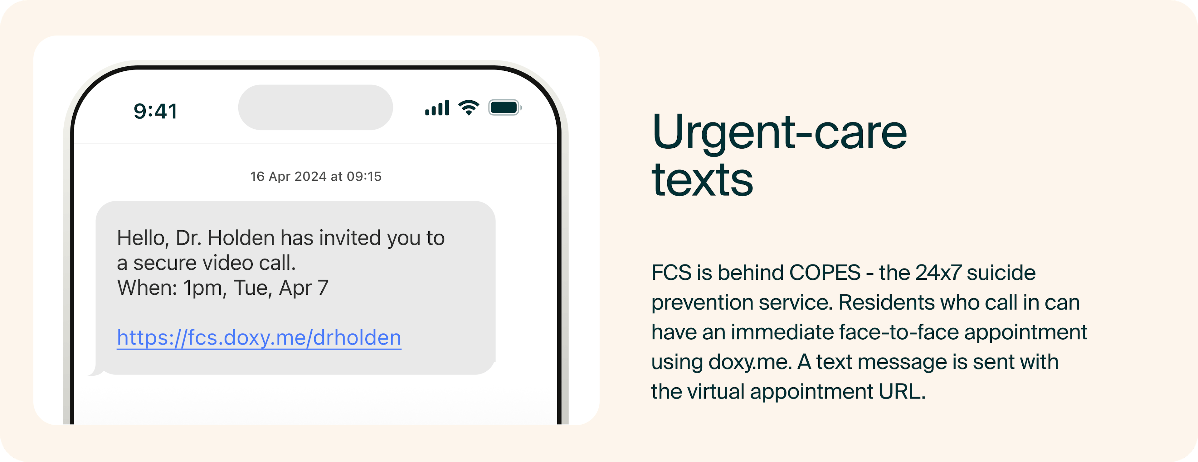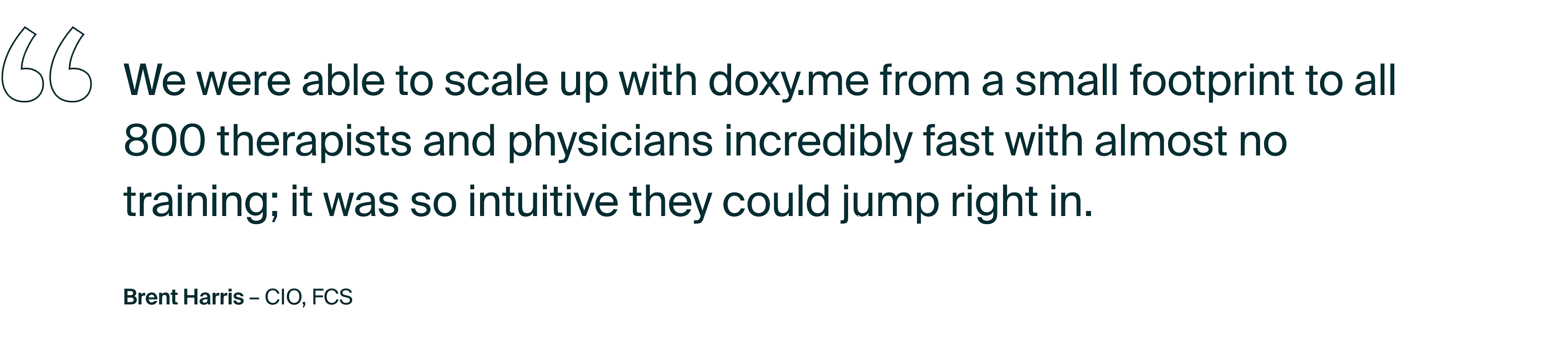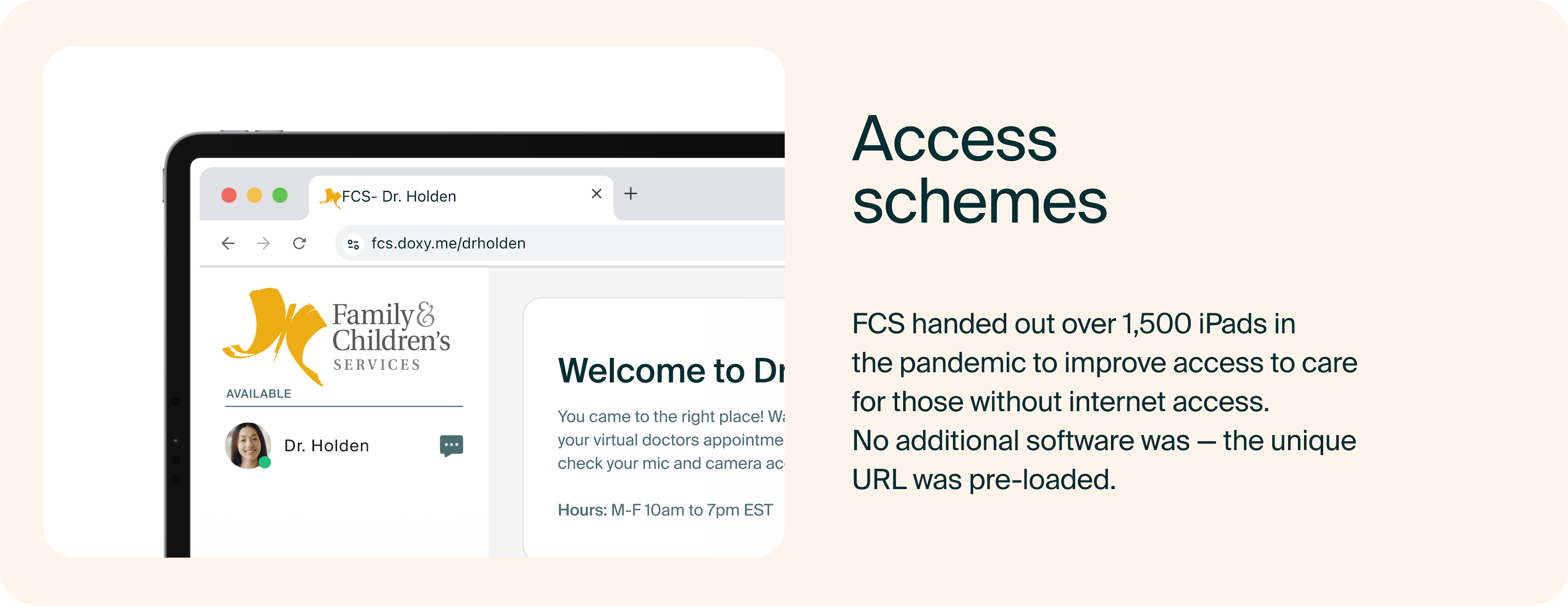 Before adopting doxy.me, FCS had rolled out cloud-based office software to support virtual appointments, but uptake was low. Those appointments weren’t as effective, and took too long to set-up, leading providers to stick to in-person meetings. In turn, this limited access for residents who didn’t have access to transport, or couldn’t take the time to travel in.