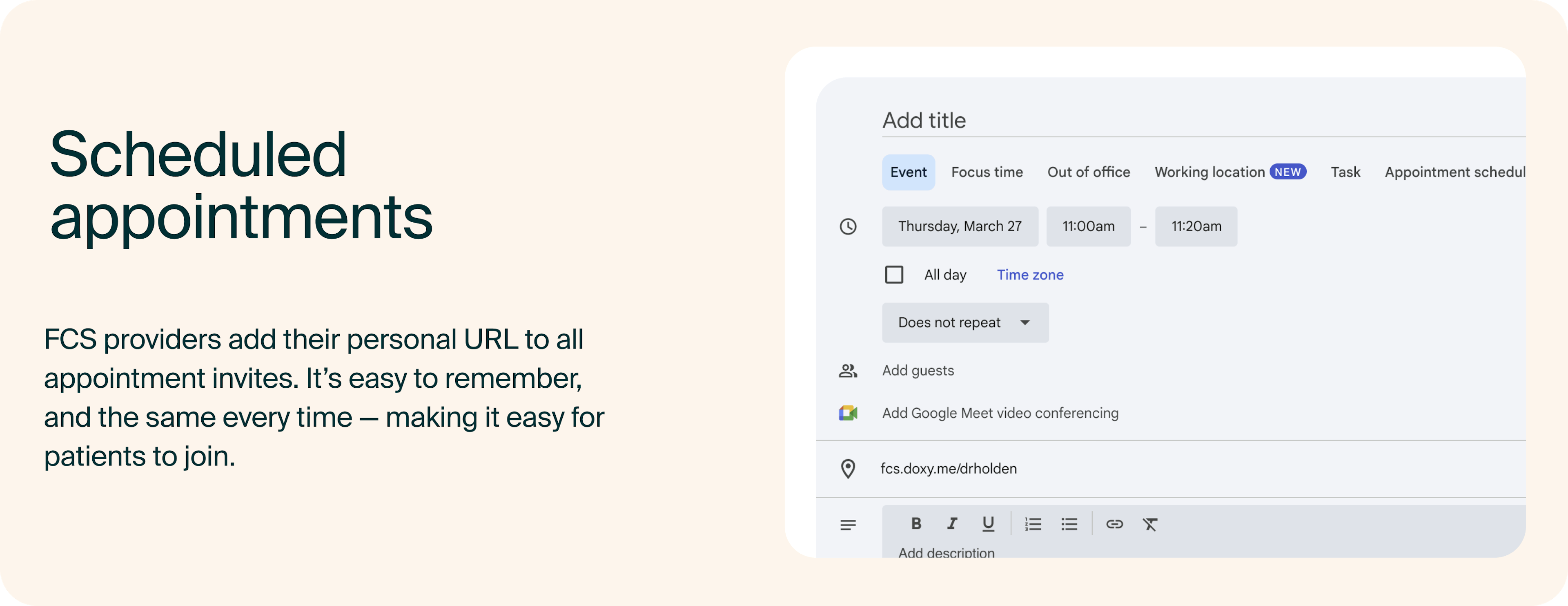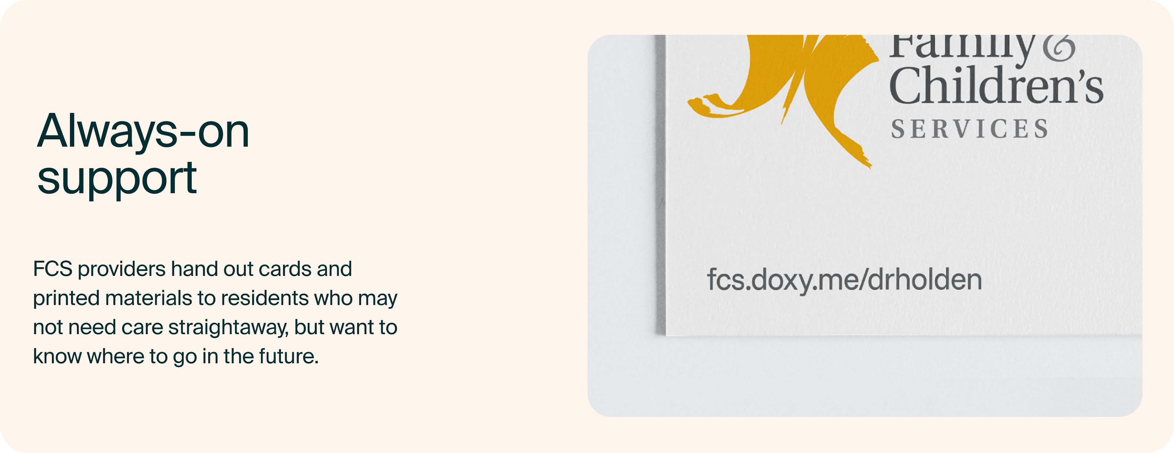 Today, the business card of every single FCS provider has their unique URL printed right on the front. With doxy.me, appointment links work the same way as a physical address: providers can always be found in the same place. As a result, it’s easy to let residents know where to go - whether that’s for a scheduled appointment, in an urgent-care scenario, or as an always-on resource.