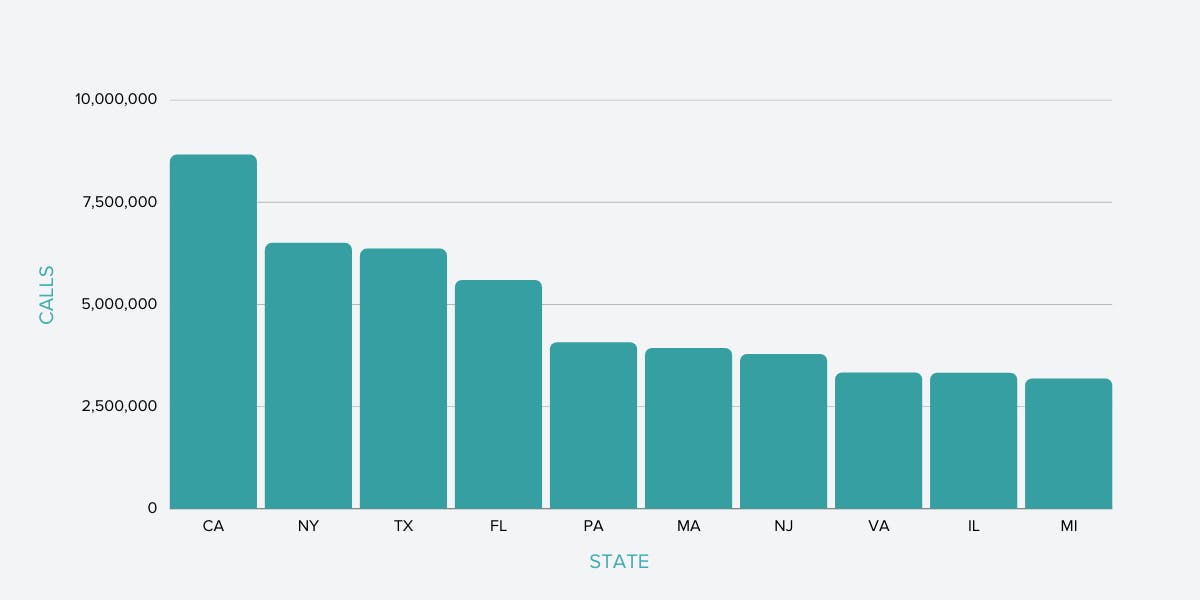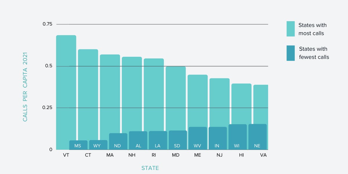 California was at the top with just over 8,000,000 calls, while Michigan notched over 3,000,000 calls in the tenth spot. These numbers aren’t surprising at all: seven of the top ten states-by-calls also fall into the top ten most populated states. The three states not in the top ten were Massachusetts (16th in population size), New Jersey (11th), and Virginia (12th). So, to make things more interesting, we looked at the top ten (and bottom ten) states by calls per capita.